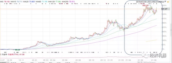 4)2020年:纯估值提升阶段。实际上,自2018年起,茅台盈利增速连续4年回落,但赚钱效应使市场选择了无视,以长逻辑(涨价)来推动股价进一步暴涨,最高市盈率超过70倍。