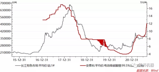 当然,我们也对当前的有“锂”走边天下的新能源疯狂行情提示一下,锂钴等小金属本质上仍然具有强周期属性。2018年相关金属曾经暴跌过,比如钴一度从69万/吨跌至22万/吨,跌幅高达70%;电池级碳酸锂从16.4万/吨,跌至4万/吨,跌幅高达75%,至今均为恢复至前期高点(图7)。相关股票在2018年调整期间,跌幅高达70%。所以,现在“锂”的各种短缺被炒上天,但一旦供需格局转变,或者情绪变化,可能会引发惨烈调整。所以,在趋势的后半段,建议缩短投资时限,出现离场信号就不要犹豫,尤其不要头脑发热或坚持做“时间的朋友”,这个跌起来比核心资产要猛烈的多。
