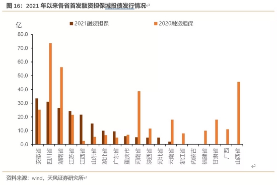 在2021年内有担保的首次发行城投平台中分省来看:浙江、江苏、山东、江西、安徽、四川、湖南等省份发行数量相对较多,而对比去年,首发较多的河南省今年在永煤事件的冲击下受到较大影响(尽管近期净融资有所恢复),其他省份趋势整体一致。
