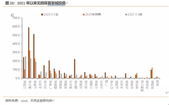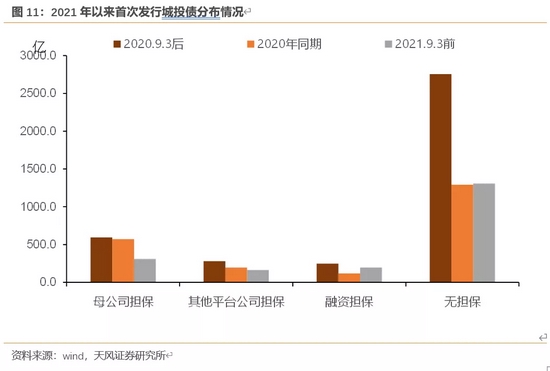 和2020年同期基本持平,2021年以来无担保裸发的首发城投债占比相对更大,达到66.29%(2020年同期为59.41%),发行规模达1308.1亿。但2020.9-12月无担保裸发首发城投债进一步扩容,达2755.3亿(主要在浙江、江苏、四川、山东等省份)。