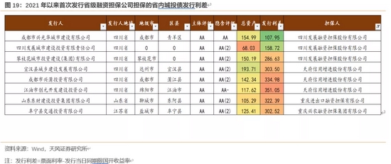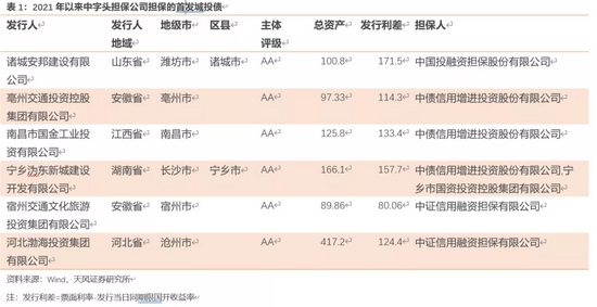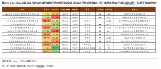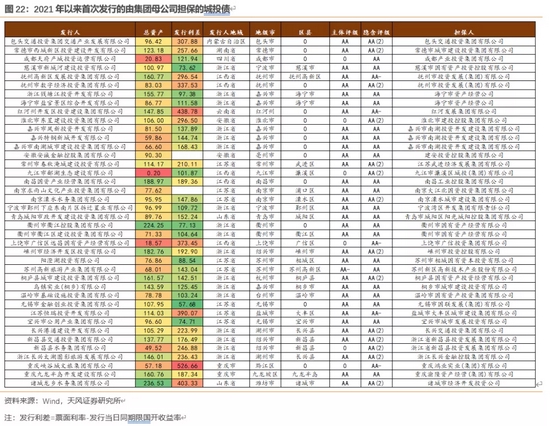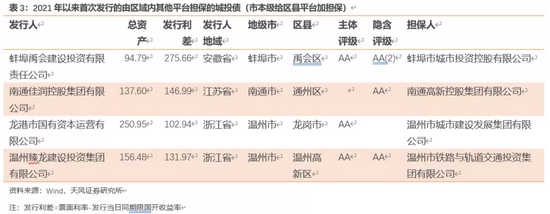 而2021年以来市本级给区县平台首发加担保比较分散,江苏及浙江的几家受益于担保方的资质,整体发行利差有明显降低,可积极关注。