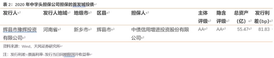 2020年唯一一家中字头的信用增进公司担保的首发城投债,即中债增担保的河南省新乡市辉县市的企业债,强担保之下发行利差大幅压缩。
