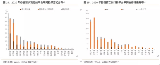 进一步区分担保类型来看,首次发行比较多的几个省份当中浙江、江苏、山东以及江西均以母公司或者区域内其他平台担保为主,其中江西由融资担保公司担保的首发城投债多于2020年;而安徽、四川、湖南等省份首次新发主体当中融资担保公司担保相对较多(且多以省级融资担保公司省内加担保为主,这或与四川、湖南几家担保公司的发展阶段相关)。