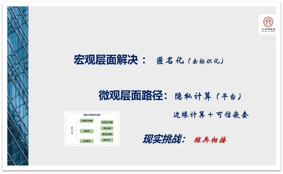 微观层面的解决,是高度关注隐私计算技术,因为,仅仅靠制度和管理,是难以从根本上解决客户数据的有效保护问题,因此,应当通过全面导入隐私计算,包括多方安全计算、可信计算、联邦学习、差分隐私、同态加密等,从根本上,刚性地解决客户信息安全和隐私保护问题。从行业和企业的视角看,特别是中小金融企业,要摒弃“单打独斗”的思维模式,在确认真问题,明确真需求的基础上,以一种更加开放的心态,开放业务场景,积极探索与相关领域的科技企业合作,打造基于个人信息保护的新商业模式。