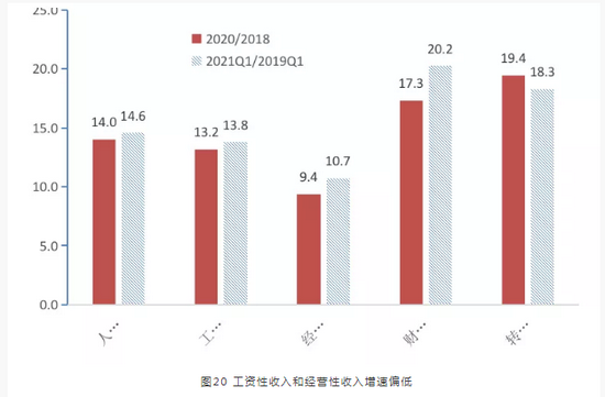 从居民可支配收入构成来看,自疫情暴发以来,工资性收入和经营净收入增速持续显著低于财产净收入和转移净收入增速。这些结构性变化表明,虽然在应对疫情的过程中,财政转移支付对最低收入群体收入进行了有效补充,同时资产价格上涨使得高收入阶层收入没有受损,但工薪阶层和个体经营收入受损严重。在培育形成以国内市场大循环为主体的新发展格局过程中,中等收入群体是未来支撑消费增长和消费升级的核心力量。对于中等收入群体的变化,特别是与高收入群体的分化,在政策层面应当予以高度关注。