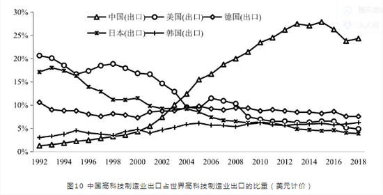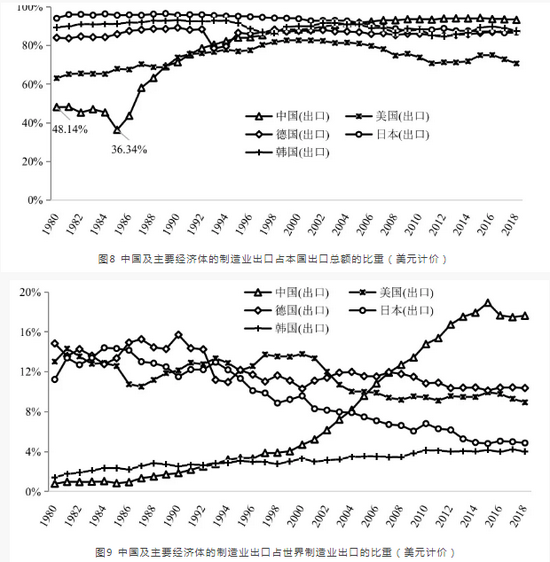 制造业尤其是高科技产业已经成为科技创新和国际竞争的主战场,但中国在这一领域的竞争力仍亟需提升。制造业作为国民经济的主体,是中国的立国之本、兴国之器、强国之基,在构建新发展格局过程中,尤需高度关注该领域的国内国际循环。从20世纪80年代中后期开始,中国制造业进出口快速提升,制造业出口占中国出口总额的比例从1985年的36.3%增长至2015年的94.3%,并占据了全球制造业出口市场近20%的份额和进口市场近10%的份额,高科技产品贸易占据了全球出口市场近25%的份额和进口市场近15%的份额。但值得注意的是,自2015年以后,中国制造业出口占世界市场的份额出现了明显下滑,同时,高科技制造业出口占世界市场的份额也明显下滑。必须审慎认识中国制造业特别是高科技产品的竞争力变化,科学分析中国出口的高科技产品中能反映本国高科技产业竞争力的成分,切勿因良好的总体规模表象而忽略国际分工背景下本国在高附加值产品或生产技术上可能存在发展瓶颈的结构性问题。
