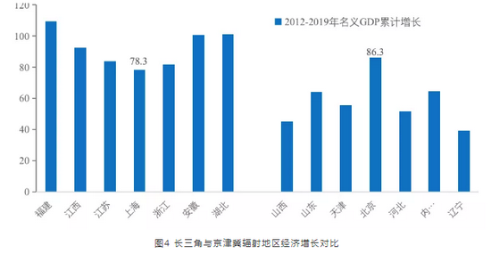 其次,从五大增长极对周边地区的增长带动情况看,长三角的辐射带动作用最为显著,京津冀的带动效果较差。2012-2019年间,在京津冀辐射地区中,北京名义GDP累计增长了86.3%,一枝独秀,但河北、天津分别仅增长51.6%、55.4%,山西、山东、内蒙古分别仅增长45.2%、64.2%、64.4%,辽宁、吉林、黑龙江分别仅增长39.3%、35.1%、23.0%。