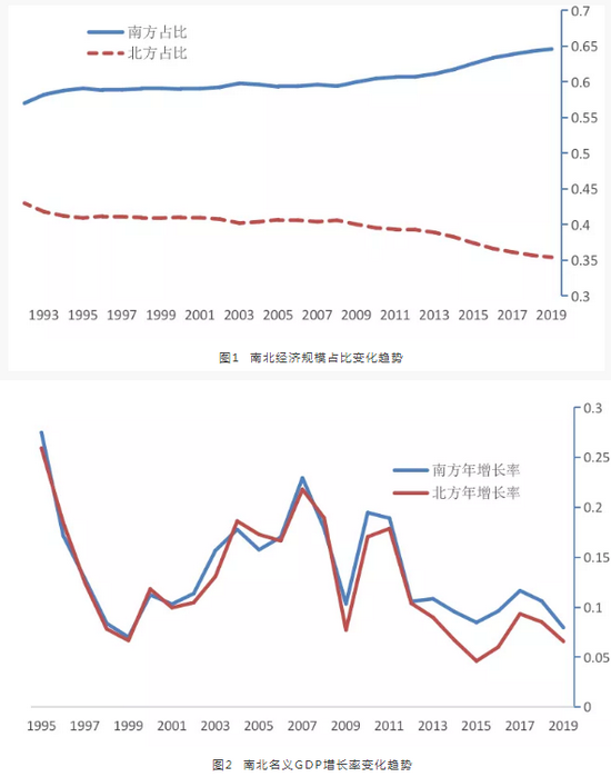 第一,南北地区经济分化呈现趋势性加速性恶化特征。1992年,南方经济(南方16个省市区名义GDP总和)在全国经济中的占比为57%,北方经济(北方15个省市区名义GDP总和)占比为43%,南方经济体量为北方经济的1.3倍;2010年,南方经济占比首次达到60%,北方经济占比降为40%,南方经济体量为北方经济的1.5倍;2019年,南方经济占比快速扩大到65%,北方经济占比缩小至35%,南方经济体量达到北方经济的1.8倍。南北地区经济分化不仅呈现出持续性、加速性的显著特征,而且已经达到了相当严重的地步。