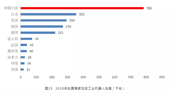 工业机器人是当前中国普及度最高的机器人种类。近年来,中国工业自动化的步伐正在加快,工业机器人在工厂中加速部署,集中在汽车行业、电子电气行业、金属和机械行业等领域。据国际机器人联合会(IFR)估计,2019年,中国共有78.3万台工业机器人运转,大于日本和美国工业机器人运转总量之和。