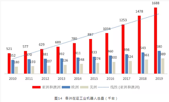 在多重压力之下,未来工业机器人的普及或许是中国制造业提升竞争力的有效路径。据国际机器人联合会(IFR)《世界机器人报告2020》,自2010年以来,全球范围内的自动化趋势大大加速了对工业机器人的需求。从地域分布上来看,工业机器人主要部署在亚洲,亚洲工业机器人部署总量远超其他各州,2019年达到2010年的3倍多。中国占据了亚洲工业机器人市场的一半或者说全球工业机器人市场的三成。