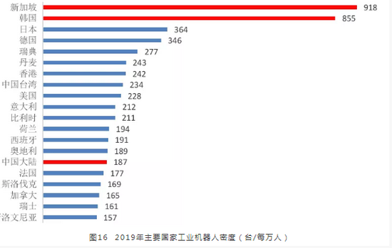 尽管中国制造业在自动化领域取得重大进展,已成为全球最大的工业机器人市场,并以每年远高于其他国家的速度加速部署工业机器人,但是相较中国庞大的制造业市场,机器人的使用密度仍然偏低。2019年新加坡平均每万名工厂工人拥有918台工业机器人,韩国为855台,日本和德国分别为364和346台,而中国每万名工厂工人仅拥有187台工业机器人,工业机器人密度仅略高于世界平均水平。考虑到中国目前较低的工业机器人密度和每年庞大的工业机器人新增量,中国工业机器人市场潜力极大,工业机器人新增速度将长时间维持在一个较高水平,使工业自动化达到一个较高水平。