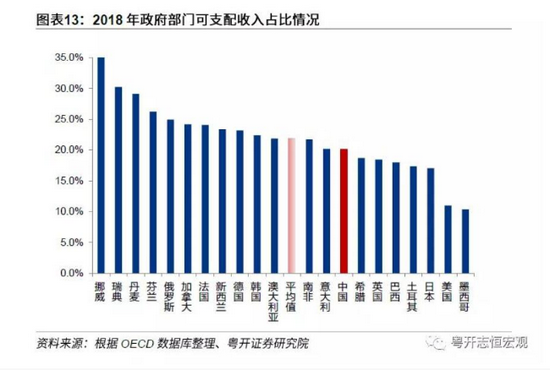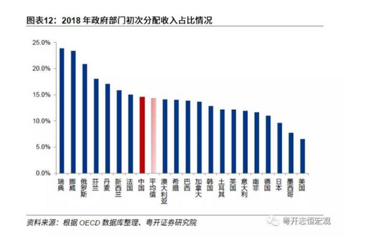 一直以来,对于中国政府收入占比是否过高的问题,各界结论莫衷一是。通过我们梳理的数据,横向比较来看,中国政府收入份额相对适中,无论初次分配还是再分配环节,中国政府收入占比与其他国家均值基本持平(图表12和13)。