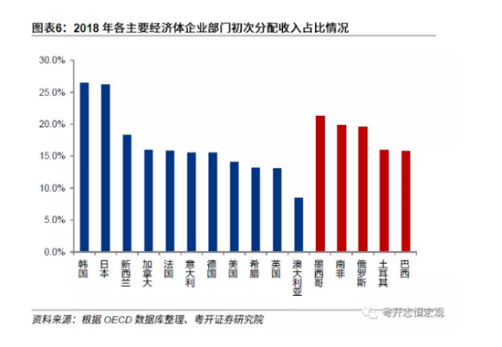 2018年,中国居民初次分配收入占比为61.2%,可支配收入占比为59.4%,与日、韩、俄罗斯等国家的比重接近,但仍低于美、英等国的平均水平。美国初次分配中居民收入占比为79.6%,英国为74.3%;美、英再分配中收入占比分别为75.9%和66.5%。中国居民收入占比低很大程度上由于劳动报酬长期被利润侵蚀所致,2008年后中国迎来“刘易斯拐点”,劳动力变得相对稀缺,劳动报酬净额占比持续上升,从30.3%升至2018年的38.4%,但较发达经济体仍有差距。例如美国为52.4%,英国为49.6%。