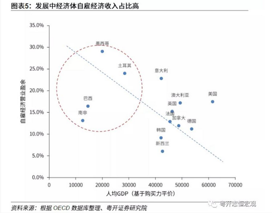 一方面,发达经济体普遍处于后工业化时期,人均资本存量高,资本相对过剩,劳动力结构性供给不足,导致劳动报酬占比较高。另一方面,发达经济体要素收入主要基于劳动雇佣关系进行分配,而发展中经济体自雇经济比重较高。这意味着个体工商户、农户等通过劳动产生的收益,没有体现在劳动报酬中,而是计入了自雇经济营业盈余中。例如,墨西哥2018年自雇经济营业盈余占比为29.0%,土耳其为24.0%,巴西为16.4%,均高于发达经济体均值(14.8%)。也就是说,虽然发展中经济体劳动报酬占比较低,但自雇经济收入占比高,使得居民收入整体占比依然较高。