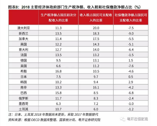 但需意识到,中国政府收入结构仍待优化:一是税收以间接税为主,不利于发挥税收“削峰填谷”的调节作用。间接税税负易转嫁,制约居民收入占比上升,而直接税的累进性有利于调节居民部门内部收入差距。2018年,中国生产税净额占初次分配收入比重为10.5%,收入税占可支配收入比重为5.4%。而发达经济体普遍以收入税为主。二是社会保障覆盖面、支出力度仍有扩展的空间。我们将社保缴款收入减去社保福利支出记为社保缴款净额,这一数值占国民可支配收入的比重为负值,且其绝对值越大,说明社会保障力度越大。近年来,中国充分发挥宏观调控作用,社保覆盖面不断扩大,社保支出不断提升,社保缴款净额占比连续6年为负数,2018年为-0.6%。但相较于发达经济体仍有提升空间,例如美国社保缴款净额占比为-7.6%,英国为-5.1%。