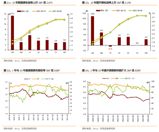 长债收益率整体上行。周一,美国8月新增就业人数低于预期,但拜登表示经济仍然强劲,国内长债收益率微幅上行;周二,中国8月出口增速高于预期,进出口继续平稳增长,长债收益率上行3BP;周三,欧元区二季度GDP增速快于预期,长债收益率继续上行1BP;周四,美国7月职位空缺数达1090万,创历史新高,8月国内CPI略低于预期,长债收益率略微上行;周五,8月国内新增贷款不及预期,但8月社融超预期,美国8月PPI增速继续上行,长债收益率下行1BP。