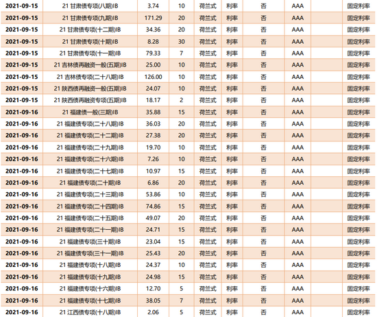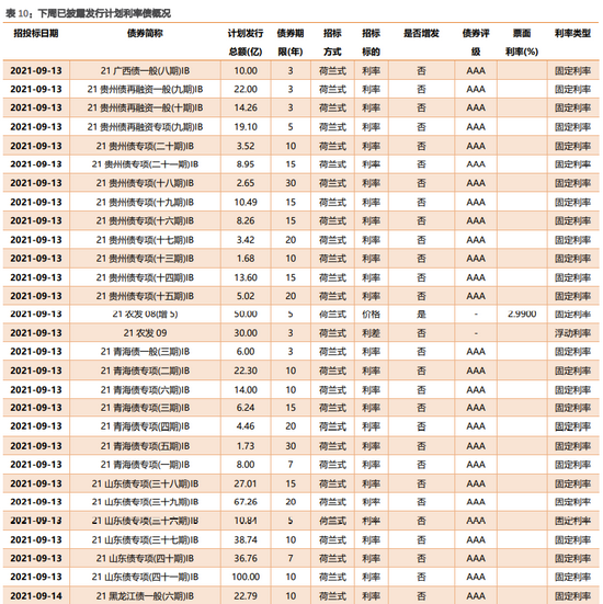 根据已公布的利率债招投标计划,从9月13日至9月19日将发行98支利率债,共计4061.41亿,其中地方政府债91支。
