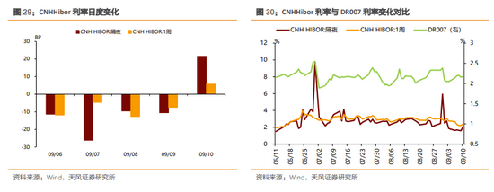 本周央行公开市场净回笼800亿元,资金面整体均衡。银行间隔夜回购利率下行1BP至2.10%,7天回购利率上行4BP至2.18%;上交所质押式回购GC001上行2BP至2.20%;香港CNHHibor隔夜利率上行46BP至2.09%;香港CNH Hibor7天利率下行-30BP至2.37%。