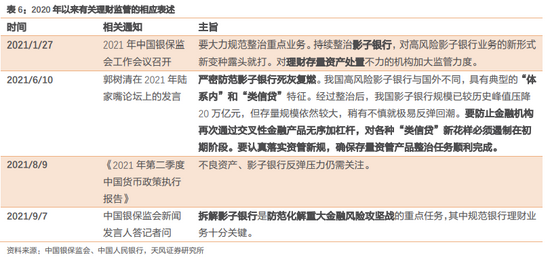 2021年6月10日郭树清在陆家嘴金融论坛上表示,“严密防范影子银行死灰复燃。我国高风险影子银行与国外不同,具有典型的“体系内”和“类信贷”特征。经过整治后,我国影子银行规模已较历史峰值压降20万亿元,但存量规模依然较大,稍有不慎就极易反弹回潮。要防止金融机构再次通过交叉性金融产品无序加杠杆,对各种“类信贷”新花样必须遏制在初期阶段。要认真落实资管新规,确保存量资管产品整治任务顺利完成”。