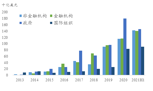 2013年以前,国际组织ESG债券发行占比超50%,世界银行等国际组织引领了ESG债券的发展。2013年以来,更多政府、企业、商业银行参与到ESG债券发行主体之列。虽然就发行规模而言,所有发行主体的ESG债券发行量都有所上升,但是国际组织的发行占比逐年下降,非金融机构和金融机构发行量占比逐步增大。