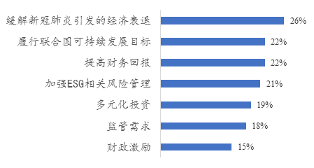 四分之三受访者认为,新冠肺炎疫情加速了其对ESG的兴趣,未来3至5年可持续投资的资金流入将继续加速增长;五分之一的受访者认为,缓解新冠肺炎疫情引发的经济衰退是未来12个月内ESG投资的主要驱动力。