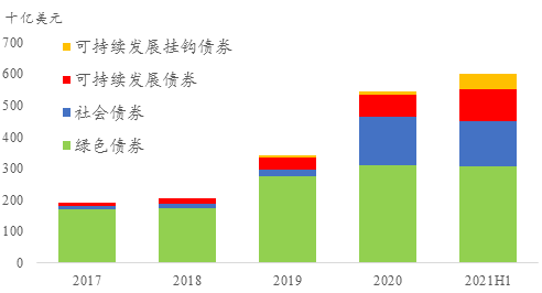2018年以来,全球ESG债券市场进入快速发展阶段,发行规模增长迅猛,不同种类ESG债券同步发展,社会责任债券、可持续发展挂钩债券增幅较大。彭博数据显示,2021年上半年全球ESG债券发行金额达5980亿美元(比2020年全年发行规模增加500亿美元),预计2021全年的发行量将超过1万亿美元,约为去年全年发行量的两倍。