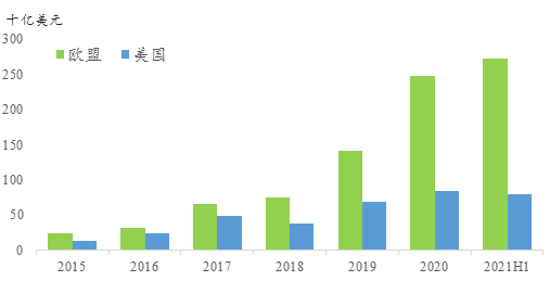全球ESG债券市场以欧盟、美国等主要经济体为主体,2021年上半年,欧盟、美国共发行超3500亿ESG债券,二者占全球ESG债券市场发行规模的58%。其中,欧盟为全球最大ESG债券发行经济体;美国发行量位居第二。