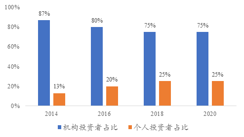 随着个人投资者对ESG投资理念的不断了解及公司披露数据逐步完善,目前机构投资在ESG投资中占主导地位,但个人投资者的投资意愿增长较快。目前,个人投资者占比从2014年的13%提升至2020年的25%。