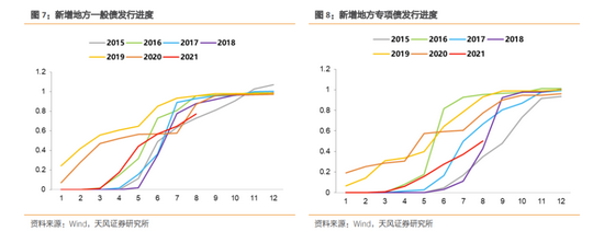 1-8月新增一般债累计发行规模为全年新增限额8200亿的77%,发行进度符合一般季节性。不过,在8月地方债加速发行的情况之下,1-8月新增专项债发行进度仅占全年限额36500亿的50%,整体而言远慢于2019、2020年。