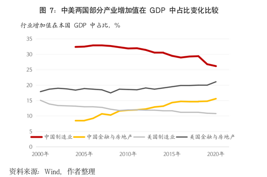三是服务业和制造业的格局重新打破,各国重视制造业回流、产业链重塑,服务业发展受到疫情严重约束。制造业、采矿业的复苏要显著快于服务业的复苏,这主要由于受疫情影响,许多国家依然实行人员的隔离封锁、入境和旅游限制等措施,而农业、采矿业等行业受到需求拉动的大宗商品价格上涨刺激,商品贸易活动并未明显受到封锁措施的影响。同时,在制造业中,受居家办公、疫情防控的需求推动,办公设备、通信设备、医疗产品的需求显著增加,相关行业受益最为明显;在服务业中,金融、房地产等行业受益于宽松货币政策和无需人员大规模聚集的推动,复苏较好;而跨境旅游和住宿、商务、餐饮等行业受到封锁措施的冲击较大,复苏乏力。到2021年6月,全球国际航线客座率仅为38.9%,仍远低于疫情前80%以上的水平;5月全球餐馆就餐人数较2019年同期下降18.9%。股票市场各行业板块走势基本反映了复苏差异化情况,特别是能源、金融、科技等板块表现突出。从统计数据看,2021年上半年美国耐用消费品的支出蓬勃发展,比疫情前水平高出约20%;而服务支出仍然比疫情前趋势水平低7%左右。中长期看,疫情发展仍具有不确定性、发达国家对制造业作用和产业链安全更加重视、更多发展中国家推动工业化进程,这些因素预计将逆转长期以来全球制造业占比下降的趋势(图7)。
