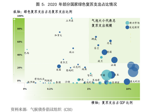 疫情暴发加深了世界各国对于经济可持续发展的关注,2020年以来世界各地极端气候频发,应对气候变化与环境保护的紧迫性日益提上日程。以中国提出“2030年碳达峰、2060年碳中和”目标、美国重返《巴黎协定》为重要标志,全球携手开展绿色低碳转型,绿色复苏的支出不断增加(图5),正在深刻重塑全球经济的运行轨迹。