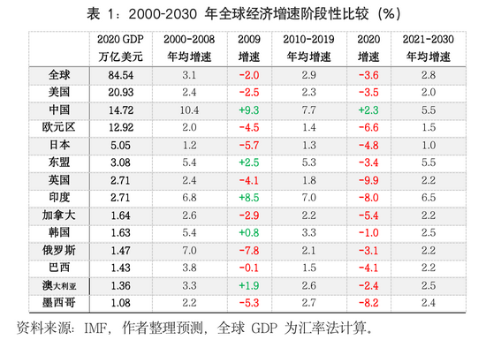 展望未来,全球经济将逐步回归常态下的中速复苏。2021年的全球经济复苏是“强刺激”加上低基数(2020年全球GDP深度衰退幅度3.3%,为二战以来最严重经济危机)等因素下的报复性反弹,经济增速预计将达到6.0%左右,是有记录以来最快增速。这意味着,全球经济总体收复失地,两年平均增长约1.3%左右。基准情况下,如果不发生新的重大扰动,未来4年仍需要平均3.8%以上的增速,才能将年均增速扳回疫情前10年2.9%的潜在增速轨道。但从现实条件看,由于疫情的特殊性和反复性,危机前损失的一次性经济产出(特别是服务业供求同时实现)难以找回,2022年以后全球经济大概率回归到常态化的低增速。这一方面是相对2008年以前场景出现过的连续多年3%以上的高增速而言的,另一方面是相对2008年危机后全球经济3%以下的潜在增速而言,由于技术进步与人口贡献因素下降(长周期)、投资消费信心不足和全球化倒退(中周期)和疫情反复、中美博弈等扰动因素(短周期)叠加,从2021-2030年全球经济平均增速预计将不会超过3%,预期为2.8%左右。