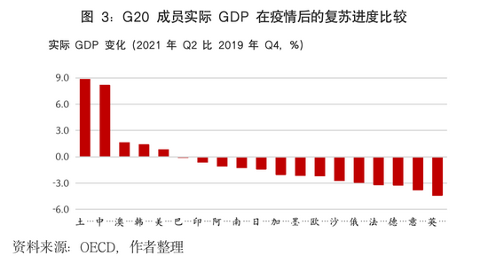 就地理区域看,东盟、中国香港与中国台湾等地区,以及澳大利亚、新西兰、韩国等国家在亚太地区处于较优的经济复苏之列。其中,2021年第二季度,中国台湾和中国香港GDP分别较疫情前增长6.8%和1.8%,澳大利亚和韩国GDP分别较疫情前增长1.6%、1.3%;印度GDP则较疫情前下降8.1%。在其他地区,巴西二季度GDP较疫情前下降0.1%,英国和欧元区GDP分别比疫情前低4.4%和2.6%,复苏相对滞后(图3)。