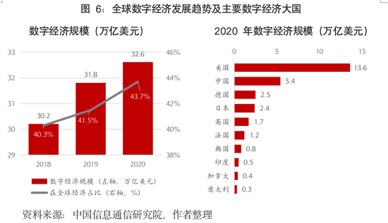二是数字化转型加快,数字技术重塑经济形态,新产业、新业态、新模式正在形成。数字化技术在疫情前就逐步创新并走向成熟,但其真正加快运用并推动整个世界经济与社会的转型,是在疫情下全球化持续发展的一个副产品。在整个疫情期间,世界各国在人员流动封锁状态下,不得不将许多经济活动从线下转到线上,由此催生了一系列新的经济形态。在线办公、在线零售、在线娱乐和教育等业态快速发展,数据正在成为重要的生产要素,数据产业化、数字经济重塑传统产业,数字经济对经济增长的贡献大幅度提升;金融科技也随之快速发展,推动金融行业服务转型。统计研究显示,2020年全球数字经济规模达到32.6万亿美元,逆势增长3%(而全球经济下降3.3%);2020年美国数字经济规模达到13.6万亿美元,设备制造、信息产业和金融业分别逆势增长3.6%、3.2%和1.7%,成为极少数实现增长的行业;2020年中国数字经济规模5.4万亿美元,增长9.6%(中国经济增长2.3%),数字经济核心产业增加值占GDP比重达到7.8%,数字经济总量跃居世界第二,成为驱动经济高质量发展的核心力量之一。未来,人类社会可能与新冠病毒、极端气候及其他类似自然灾害等长期共存,数字化转型发展正在成为全球经济复苏的重要方向,正在深刻改变人类社会的生产与生活方式。