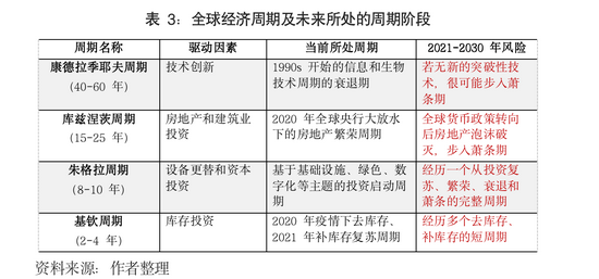 与此同时,还应高度关注中长期经济周期与短期金融周期的同频共振,放大全球性系统金融风险。从技术创新为驱动的康德拉季耶夫周期(40-60年的长期周)看,自上个世纪90年代以来信息和生物技术驱动的本轮长周期在2021-2030年正处于衰退周期;从房地产和建筑驱动的库兹涅茨周期(15-25年)看,自美国2007年次贷危机爆发以来的本轮全球房地产周期,在2021-2030年期间也可能处于从泡沫积累到破灭的衰退周期;从设备更替和资本投资驱动的朱格拉周期(8-10年)看,2021-2030年期间全球经济在新冠疫情冲击之后,可能步入一个以基建投资(美国为主)、绿色投资(碳达峰)和智能化转型投资(数字技术)为主题的新周期。多个长周期叠加库存投资驱动的短周期(2-4年的基钦周期)之下,应高度关注未来10年内全球经济多周期碰头引发的系统性风险(表3)。