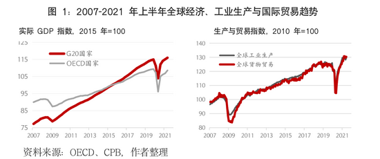 2020年疫情带来的经济影响史上罕见,大封锁导致经济活动暂停,全球化背景下迅速引发各国经济共振,全球经济迅速陷入衰退,衰退斜率异常陡峭;随着中国迅速控制疫情、美英率先攻克疫苗技术解封经济,各大经济体快速采取前所未有的大规模经济刺激措施,全球经济迅速反弹,反弹斜率也非常陡峭。因此,从通胀调整后的实际经济指数曲线上看,2020年到2021年,全球经济呈现了“深V”形走势,V形底部在2020年第2季度(图1)。到2021年第2季度,占全球经济86%左右的G20成员的整体经济已经收复疫情中的失地,比疫情前增长0.8%;全球工业生产和全球贸易量已经超过疫情前水平,产出缺口收窄,实体经济向潜在增长水平收敛。与2008-09年全球危机后较长时期的“L形”缓慢复苏相比,2020-21年全球经济呈现显著的“V形”快速复苏态势,其主要原因是本次疫情危机并非金融危机,疫情解封、超常规的政策刺激、发展相对稳健的金融机构与活跃的金融市场,对投资与贸易反弹发挥了重要的推动作用。