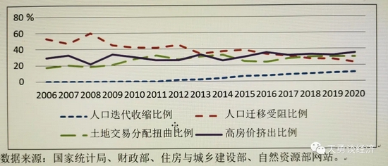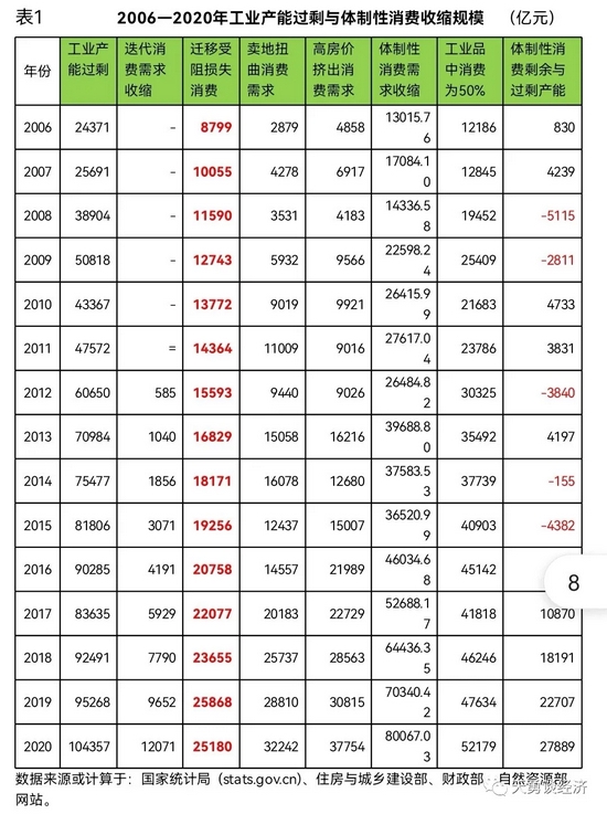 从四大影响居民消费需求的二元体制扭曲看,(1)人口收缩造成的消费需求,从第一年看影响不大,但因为趋势为迭代式下行收缩,长期来看累积性影响会越来越大。2006年,由于前20年1986年人口还处于上行增长点,其20年后人口变动对消费需求还没有发生收缩影响。但2012年开始,由于20年前1992年人口总和生育率跌到2以下水平,20年后劳动力收缩使消费支付能力收缩,其对产能过剩的贡献强度这一年为1.96%,2020年时却上升到了11.26%。(2)迁移受阻造成农村居民消费累积损失很大,而且从动态看,人口再转移而增强消费能力的难度越来越大。15年中,由于城乡户籍分割等造成的迁移受阻,淤积在农村中的人口累积损失了258711的消费需求能力。但动态看,其对产能过剩的影响强度从最高2008年时的60.4%下降到了2020年时的23.46%。变化的原因是淤积在农村人口中老年化而迁移能力下降,老年人口在增多而消费率不高,老年人口死亡率在上升而消费需求在退出。(3)农村和城郊土地征收交易收入在政府与农民间分配扭曲影响了农民合理的收入流量,按农民收入消费率计算,2006—2020年间,造成的消费需求能力损失为211191亿元。动态看,土地交易收入分配扭曲造成的农民消费需求收缩,对产能过剩贡献的强度,2006年时20.13%,2014年最高时上升到33%,2020年为30%。(4)城镇住宅单一渠道供给扭曲,其高房价过度转移了买房居民收入,15年来,累积挤出消费能力239240亿元。其挤出的消费需求2006年时,对产能过剩贡献的强度为29.38%,2020年时上升为35.2%。