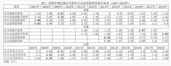 有的国家中小企业情况不佳,利率不能覆盖风险。比如意大利,中小企业不良率从2008年的12%升至2016年的31.3%,2018年略降至28.4%,但中小企业贷款利率从2008年的6.3%降到2016年的3.2%、2018年的3.1%,收益完全不能覆盖风险。法国虽然不良率没有意大利那么高,公司贷款不良率2007年至2018年一直在3%以上(无单独的中小企业不良率数据),但大企业和中小企业贷款利率却都在2%以下,这样的定价无法覆盖风险。所以法国、意大利中小企业融资缺口大,贷款难问题突出(图1、图3、表2)。