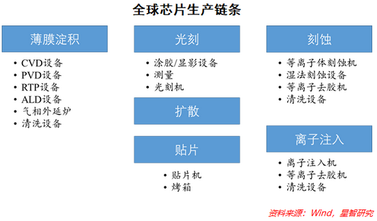 全球芯片相关产业的产业链条大致如下。由于材料和技术等领域的较为明显的差距,国内芯片产业链分布与全球不大相同。国产芯片看,主要包括芯片设计、芯片材料、制造设备和芯片封测这几大领域,而在芯片制造的上游领域,国内与全球先进水平的差距不小,尤其是在光刻环节,而晶圆代工的生产技术也缺少顶尖硬货。