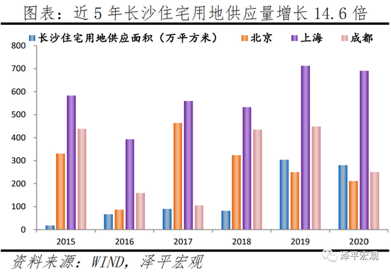 从土地用途看,近5年长沙住宅用地供给增长近15倍,商住用地供给量增长2倍,其增长率均不同程度高于北京、成都等城市;从人均土地面积看,近10年长沙人均土地供给超15平方米/人,位居二线城市前列,长期长沙人口持续流入,但长沙采取加大供地的方式形成简易版的“人地挂钩”。2018年7月,长沙出台《关于进一步加强土地市场调控的工作方案》提出大力整顿“捂地惜建、囤地不建”行为,严格依法处置土地闲置和项目延期开工;同时全力保障安居型商品住房用地,在新挂牌出让的商品住宅用地中,将安居型商品住房供地比例提高至60%以上。长沙商住和住宅用地供给量在2015年经历回落以来双双迎来高速增长期。2020年,长沙商住用地供给面积为220万平方米,相比2015年的73万平方米增长199.6%;住宅用地供给面积为279.46万平方米,相比2015年的18万平方米增长14.6倍。而近5年上海商住和住宅用地供给量增长分别为286.9%、18.4%;成都商住和住宅用地供给量增长2.4%、-42.9%;北京商住和住宅用地供给量增长分别为-0.8%、-3.6%。上海经历了住宅和商住用地供给量双增长,但住宅用地供给量涨幅较小,仅为18.4%,而北京的住宅和商住用地供给量均有所下滑,成都则是住宅用地供给大幅下降,全国很少城市出现长沙住宅和商住用地供给量趋势出现“双高峰”的情况。土地供给面积方面,2010-2020年长沙的人均土地供给面积为15.7平方米/人,位居二线城市第三,仅次于太原(21.6平方米/人)、武汉(16.4平方米/人),而同期青岛、南京、杭州、成都的人均土地供给面积分别为15.0、12.4、10.9、9.8平方米/人,分别位居第四、第五、第六、第七。