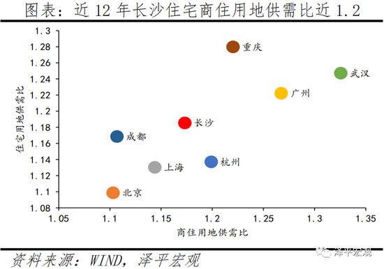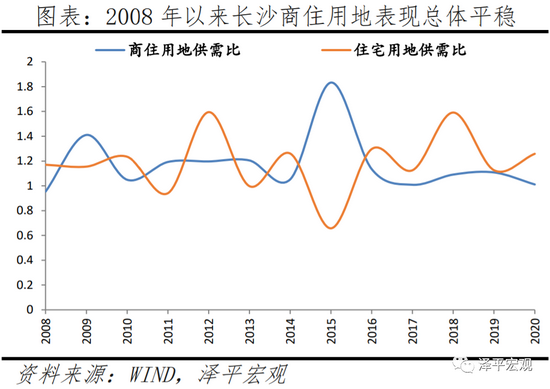 从土地供需比看,长沙商住和住宅用地供需比相对均衡稳定, 近12年长沙商住和住宅类用地平均供需比近1.2,略高于北京、上海、杭州等城市,且长期保持平稳大于1的状态。土地供需方面,2008年以来长沙的商住用地和住宅用地供需比长期维持在近1.20的水平,但住宅用地供需比波动较大,数次下探至1以下。商住用地方面,2008-2020年长沙商住用地平均供需比为1.17,高于上海(1.14)、成都(1.11)、北京(1.10),长期商住用地供应可满足需求。住宅用地方面,2008-2020年长沙的住宅用地平均供需比为1.19,高于成都(1,17)、杭州(1.14)、上海(1.13)、北京(1.10),长期长沙住宅用地供需平衡。