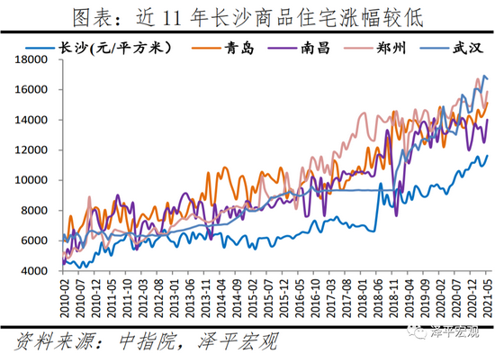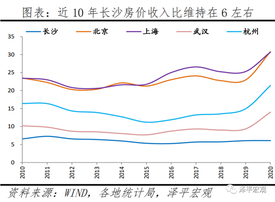 从房价绝对值看,2021年7月长沙二手房均价1.1万元/平方米,低于武汉、郑州、南昌等二线城市;从房价收入比看,近10年长沙维持在6-7,处于全国下游水平;从房价涨幅看,近10年长沙商品住宅年均涨幅低于9.4%,低于大部分二线城市房价涨幅。从房价绝对值看,根据中国房价行情网数据,2021年7月长沙二手房均价为11487元/平方米,位居全国第64位,低于周边省会城市武汉(19979元/平方米)、南宁(13510元/平方米)、南昌(13061元/平方米)。从房价收入比看,2010-2020年长沙房价收入比维持在6-7,在主要大城市中居于末位,同期北京从22.5升至30.8;杭州从16.4升至21.4。从房价涨幅看,根据中指院数据,2010-2021年5月长沙市新房均价年均涨幅9.4%,低于郑州、南京、武汉、南昌的11.4%、11.0%、10.7%、9.7%。2020年长沙GDP全国第15,GDP增速与成都并列全国第4,经济发展迅速的同时兼顾“稳房价”。2020年12月住建部在《建设工作简报》第79期刊载题为《长沙市落实主体责任稳妥实施房地产市场平稳健康发展长效机制》的文章,对于长沙在房地产市场调控方面的经验给予充分肯定,建议全国学习“长沙模式”。
