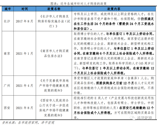 从人才购房看,2017年长沙在全国较早提出非本市户籍的专科及以上学历人才,须满足在长工作生活24个月才能购买住房(需提供24个月工资流水和居住证),时间长于广州、南京、西安等城市,限制短期运用人才政策进行投机的行为。具体来看,2017年8月出台《长沙市人才购房及购房补贴实施办法(试行)》,其中规定非本市户籍的专科及以上学历人才,须满足在长工作生活24个月才能购买住房。而南京在2021年1月《南京市人才购买商品住房办法》规定,南京则取得博士学位的人才,与单位签订1年及以上劳动合同即可,广州市则2021年4月才发布的《关于完善我市房地产市场平稳健康发展政策的通知》规定,广州仅须提供购房之日前12个月在人才认定所在区连续缴纳个人所得税或社会保险的缴纳证明即可。在人才购房方面,长沙与广州、南京、西安等城市相比限制政策不仅出台较早,且对于获取购房资格时长限制更严,这能够充分筛选出意愿定居于长沙、为长沙作出贡献的人才,限制短期运用人才政策进行投机的行为。