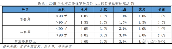 从房屋契税征收看,长沙首套房契税征收税率与一线城市及同类型省会城市基本持平,但在2019年率先在全国取消二套住房契税优惠政策,二套房屋及以上的契税征收标准达4%,高于北京、上海(3%),契税税率较高,增加购买多套住房成本,限制投机行为。首套房契税征收标准方面,长沙首套房且房屋建筑面积不超过90平方米的,契税标准为1%;大于90平方米的,按照1.5%的税率征收契税,与上海、杭州、武汉等地持平。二套房屋及以上的契税征收标准方面,2019年之前,长沙实行2016年财政部在购房契税上的税率优惠政策,二套房契税与全国其他城市(除北京、上海、广州和深圳)持平,建筑面积在90平方米及以下的,按照1%的标准征收契税;90平方米以上的,契税税率为2%。2019年长沙市出台《关于调整长沙市第二套住房交易环节的契税政策的通知》,规定自2019年4月22日起,在长沙市范围内停止执行对家庭第二套改善性住房的契税优惠税率,二套房屋及以上的契税征收标准达4%,而武汉、杭州等城市依旧实行2016年财政部在购房契税上的税率优惠政策。具体来看,二套房建筑面积小于或等于90平方米的房产,长沙征收的契税为4%,高于北京、上海的3%和武汉、杭州的1.0%;二套房屋建筑面积大于90平方米的房产,长沙征收的契税为4%,高于北京、上海的3%及武汉、杭州的2.0%。三套房屋及以上所有建筑面积,长沙征收的契税为4%,高于上海、武汉的3%。契税税率的较高增加购房者的成本,可适当压制购买二套住房的需求。