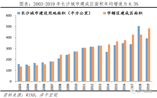 2000年以来长沙实行“东拓西进,南移北扩”策略,城市建成区面积不断扩大,且规划目标被多次提前完成,土地供应量得到长期保证。1990年版《长沙市城市总体规划(1990-2010年)》提出至2010年时,长沙建设用地规模245平方公里、总人口230万。2003年版总规提出到2020年,主城区实际居住人口要控制在264万人以内,建设用地控制在253平方公里以内。这一目标均在2008年被提前实现,因此2014年修订的《长沙市城市总体规划(2003-2020年)》(2014年修订版)、将2020年目标提升至人口规模629万人,城市建设用地规模629平方公里。2019年,长沙实际建成区面积比2000年的119平方千米扩展了3.07倍,2003-2019年长沙市建成区面积和建设用地面积年均增速分为8.3%、5.8%,均处于较高增速,而同期深圳、武汉的建成区面积年均增速分别为3.7%、5.5%,建设用地面积年均增速分别为3.6%、3.8%,长沙土地供应量得到长期保证。