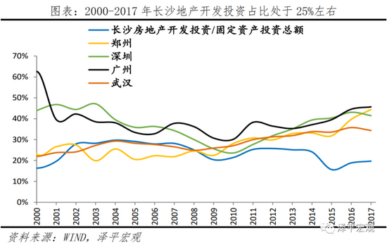 2000-2017年长沙房地产开发投资额占全市固定资产投资额比例处于25%的合理区间,房地产固定资产投资占比大于25%会导致供过于求,超过一般城市化进程所需的金融资源会导致泡沫,相反则会影响城市的正常发展。2000-2017年长沙房地产开发投资额占全市固定资产投资额比例维持在25%左右波动,平均值为23.8%;而深圳、广州、成都的占比分别为37.0%、38.8%、31.2%,与25%的合理衡量值相差较大。