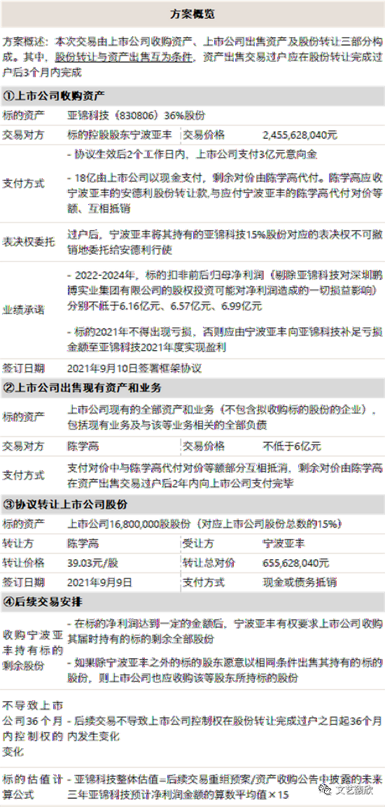 三方交易:安德利的交易方案下未来上市公司控制权归属于荣新基金,装入资产是与荣新基金无关联关系的亚锦科技,作为未来上市公司主业的亚锦科技的控股股东宁波亚丰只持有安德利15%的股份。这是典型的三方交易。交易方案中针对上市公司控制权做了一些安排,比如各方在交易协议中约定本次交易不会导致安德利的控制权在36个月内发生变更,在交易方案公告的次日,宁波亚丰又对《权益变动报告》进行了修正,在未来12个月是否增减持安德利股份的安排方面,由不确定变更为不存在增持或者减持的安排。但由于本身安德利的实控人荣新基金是通过获得第二大股东秦大乾的表决权委托获得上市公司的控制权,表决权委托的不稳定性我们在《表决权委托争议再现,海伦哲原实控人撤回“不可撤销”表决权委托》等文中已有论述,加之标的资产亚锦科技相对安德利的体量过大,安德利又是通过获得宁波亚丰持有亚锦科技15%股份的表决权获得对亚锦科技的并表,未来若要进一步增持亚锦科技不管是定增融资还是直接发行股份购买资产都可能导致安德利的股权结构有较大的变动。这种情况下,要说服监管机构荣新基金对安德利的控制权稳定是有难度的。