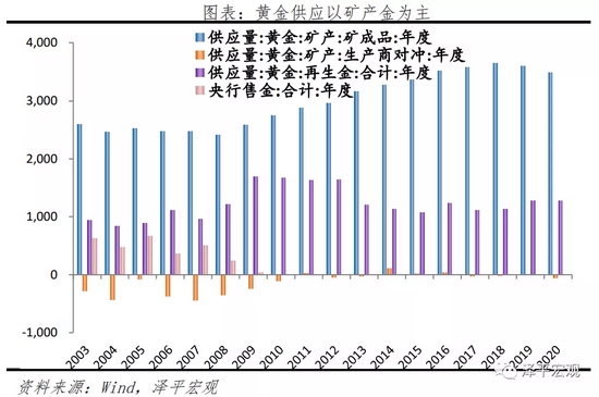黄金的供给主要包括矿产金、生产商对冲、再生金和官方售金。自有人类文明以来,世界共开采黄金19.7万吨,尚有大约4.7万吨黄金可待开采,意味着全球黄金储量中大约 76%已被开采。2003年至今,黄金年供给量变化不大,约为4000吨左右,占存量比重仅2%。具体来看: