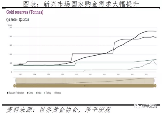 受美国长期货币超发影响,美元信用货币地位受到冲击,从2009年起,全球央行从黄金净卖出转为黄金净买入,未来黄金净购买量可能仍保持强劲的增长态势。当前各国央行持有美元外汇储备的收益降低、风险提高,各国开始战略性增持黄金。与发达国家相比,以中国、印度、墨西哥、俄罗斯以及土耳其为代表的新兴市场国家黄金储备占比仍显著偏低,新兴市场国家已经把提高黄金储备占比作为国际储备多元化的一大方向。根据世界黄金协会统计数据,2021年上半年全球央行共购进333吨黄金,比五年来的上半年平均水平高出39%,未来新兴市场央行持续的购金行为或将成为长期的金价支撑。