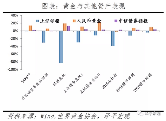 而在金融资产不断扩张的同时,其对系统性风险的对冲需求也会越发旺盛。黄金作为独立于国内资产的贵金属,有其天然的系统性风险对冲性。黄金作为相对易配置,同时受到美元指数、国际风险系数、美国实际利率、世界通胀水平、全球黄金供给水平以及全球需求水平等因素综合影响。相对国内经济单一波动影响来说,配置黄金能够在中国股市发生系统性风险时起到对冲作用。根据世界黄金协会的数据,当上证综指下跌幅度超过一个标准差时,黄金与其呈现负相关性;当上证综指上涨超过一个标准差时,黄金与其呈现正相关;同时,在中国市场抛售时期,黄金的平均收益率为10%,起到了对冲国内权益风险的作用。